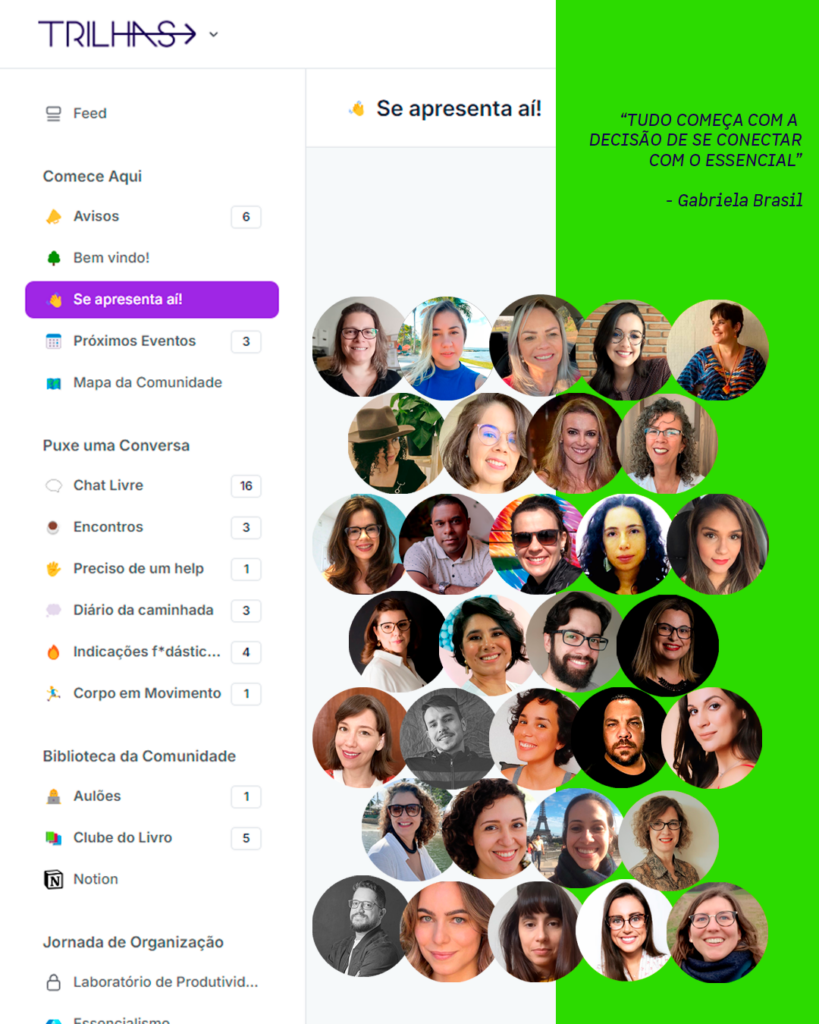 TRILHAS é o espaço de prática do processo de autoconhecimento e ação que gera um estilo de vida organizado e conecta as pessoas ao que realmente importa pra elas.